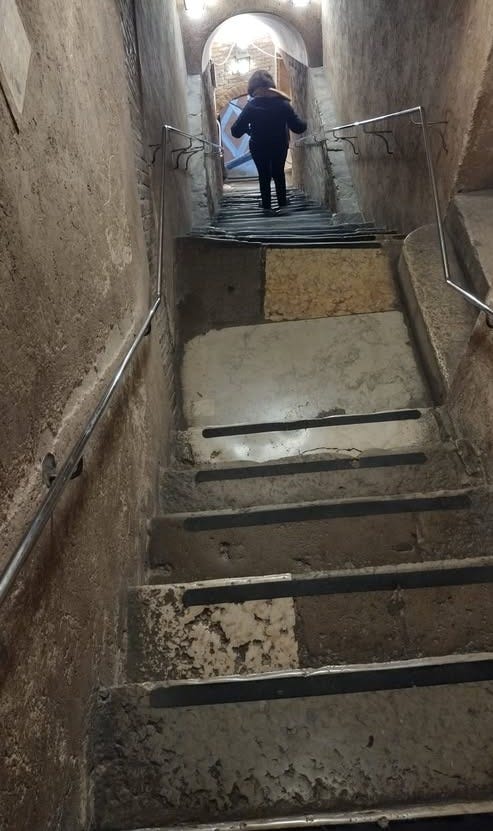The steps are worn deep at the center.