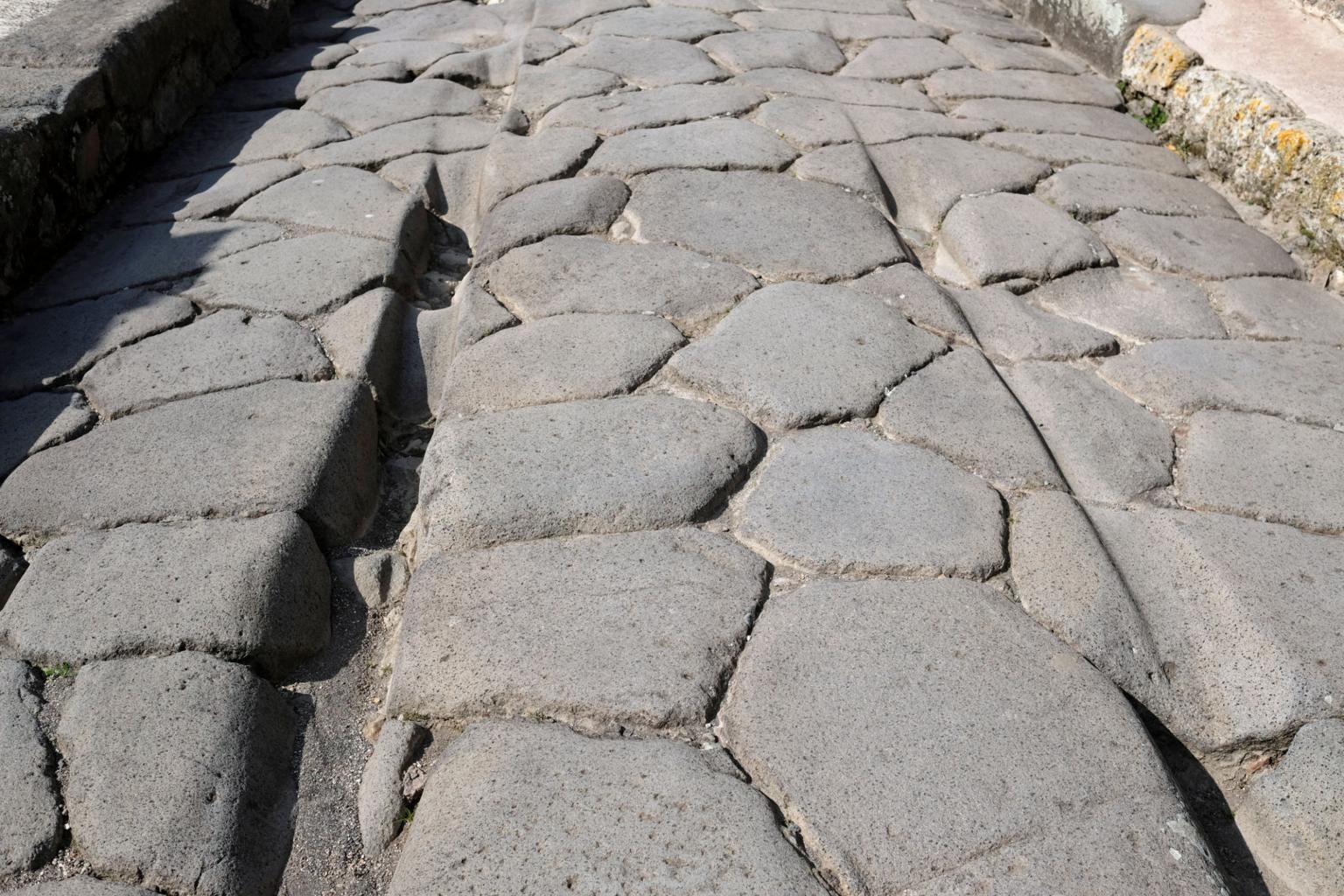 The streets are intact, laid with original cobblestones that shift slightly as I step. Deep grooves cut through the stone, worn down by centuries of clattering wagon wheels long before the city was buried.