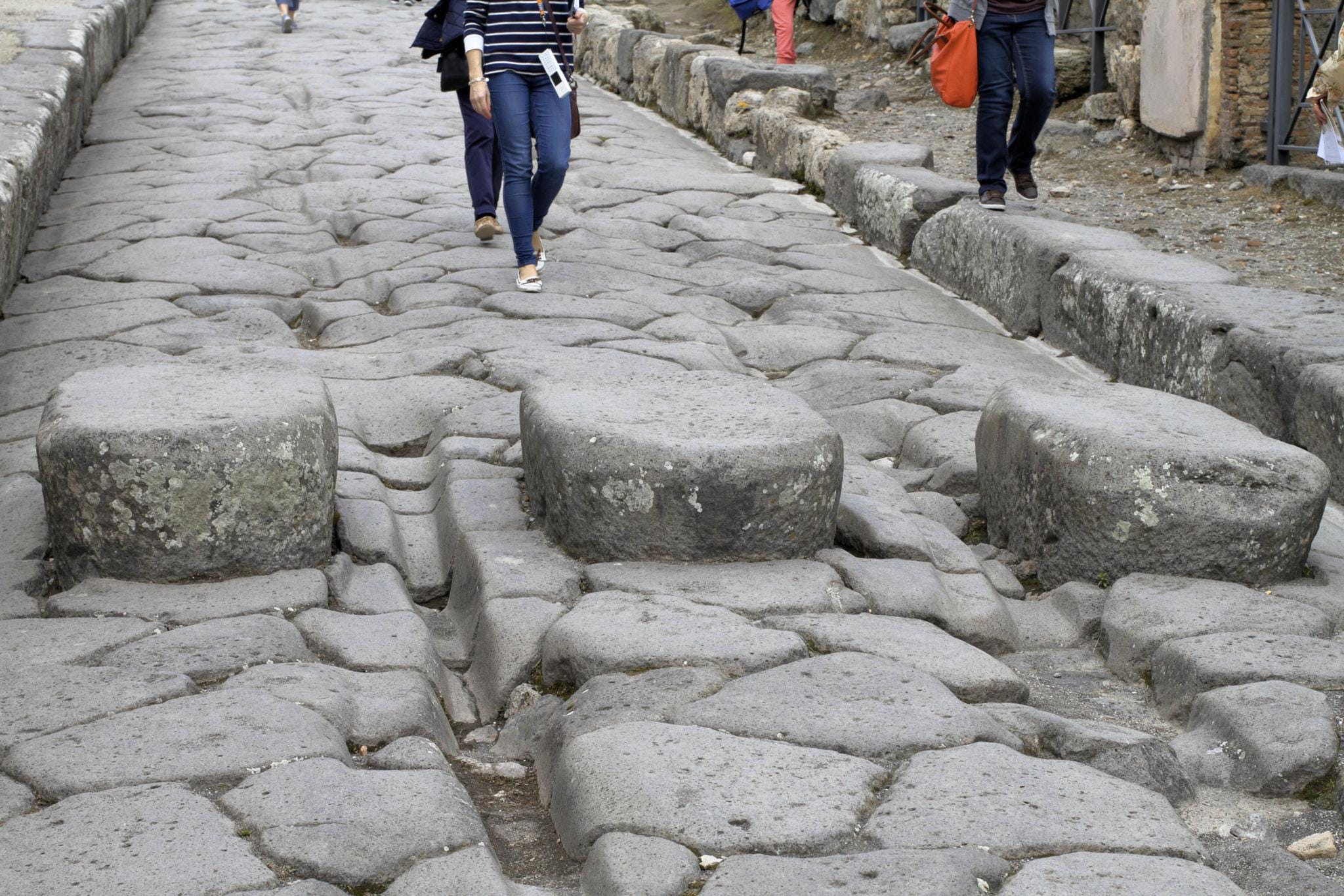 Deep ruts carved by Roman wagon wheels are still visible in Pompeii’s streets. Large stepping stones allowed pedestrians to cross above muddy water and sewage while carts passed between them.
