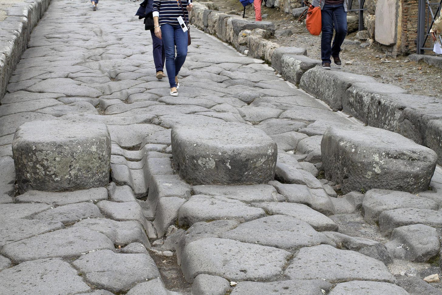Pompeii’s stone streets still show the ruts carved by Roman carts nearly two thousand years ago.