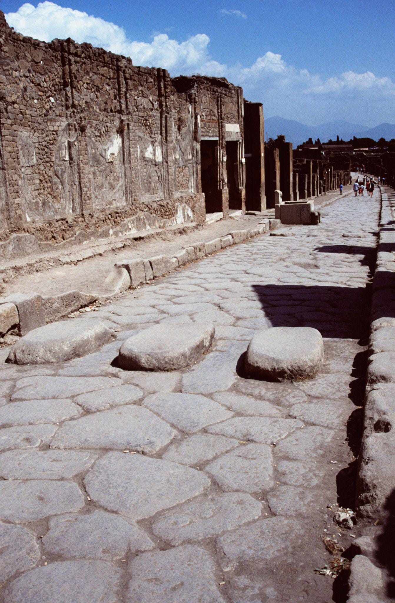 Like many ancient cities, Pompeii had a constant problem with streets soaked by rainwater, animal manure, and human waste that flowed down shallow gutters along the road.