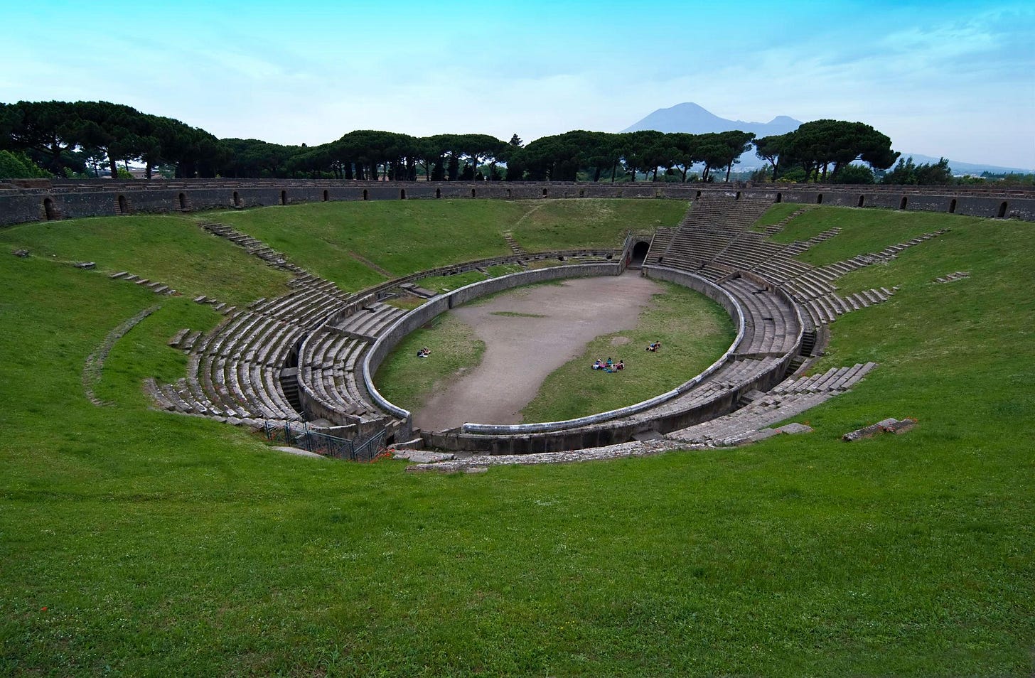 The Pompeii amphitheater is a right turn off the main road, across from the gardens.