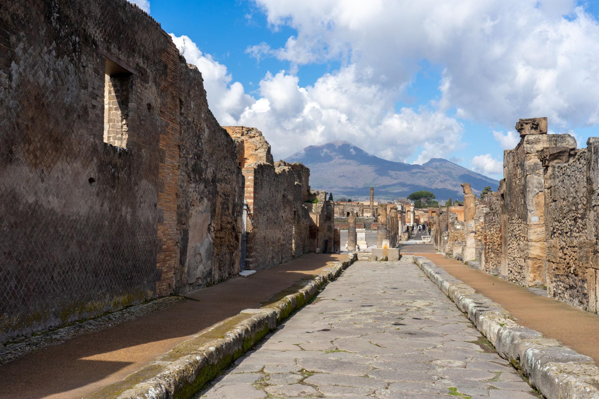The road is straight, running toward Mt. Vesuvius on the horizon.